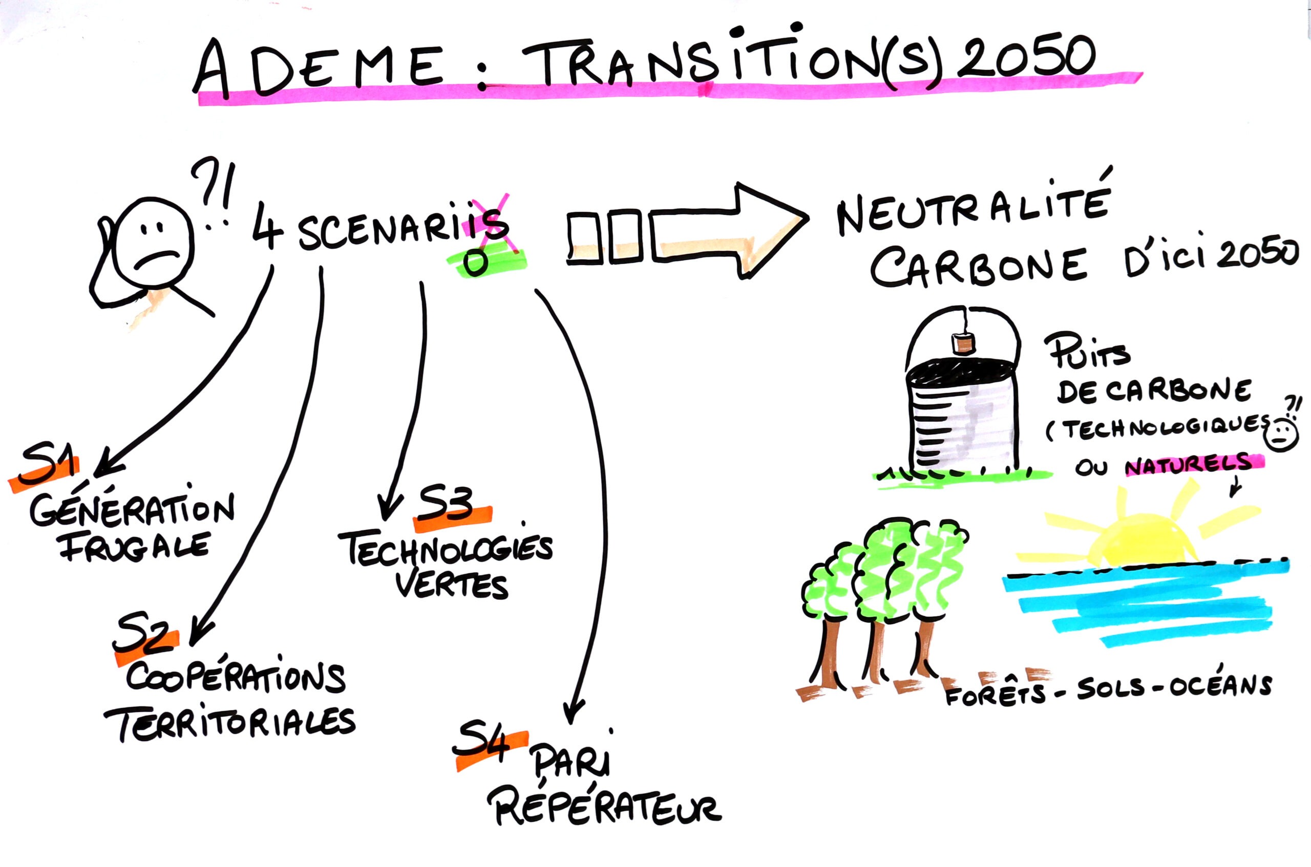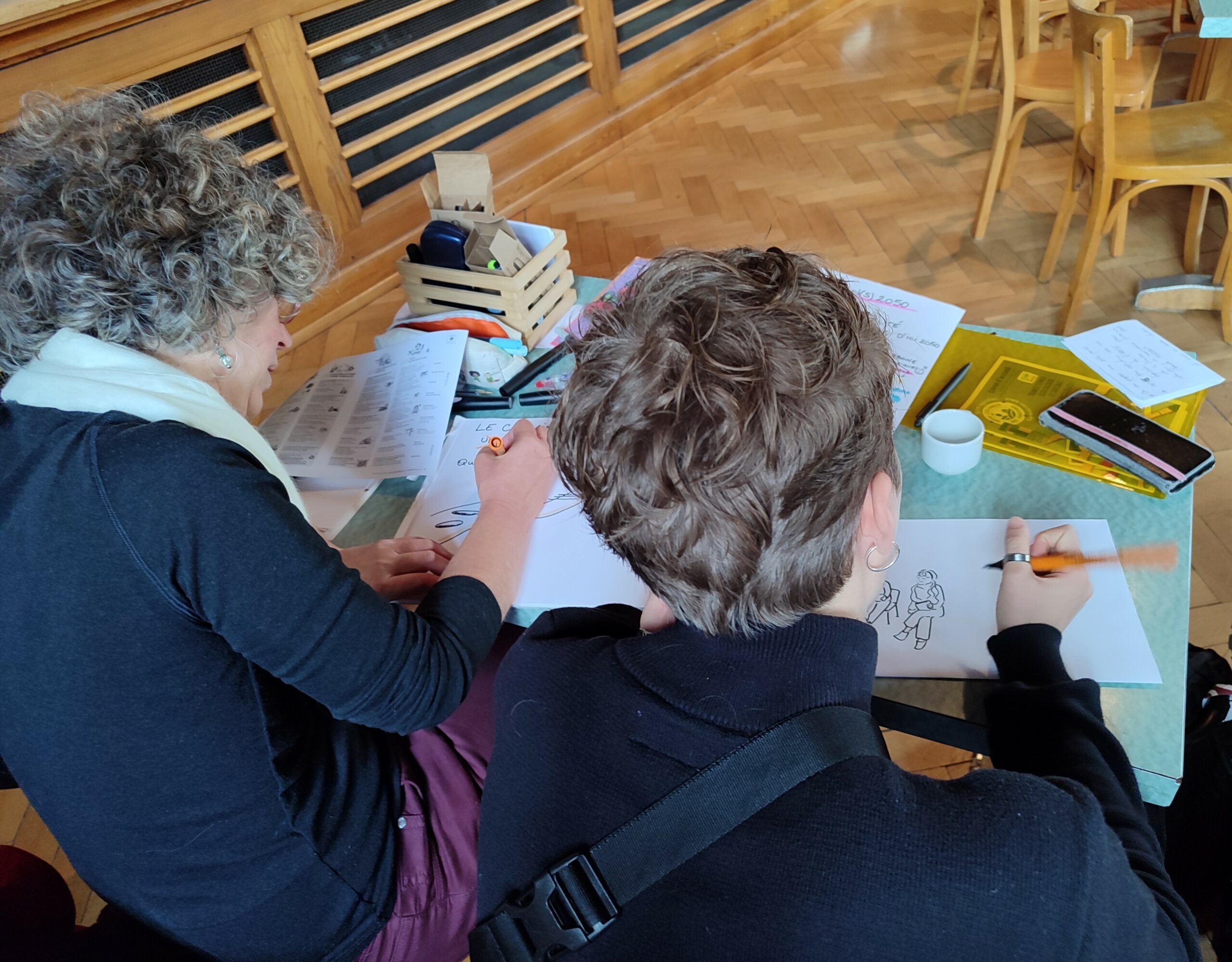 Restitution graphique de la présentation de l’ADEME : une synthèse efficace et talentueuse par Agathe Pillot Copilote bénévole de la Commission Transition(s) écologique et sociale (TES) de la CNFR, Agathe Pillot s’est formée à la facilitation graphique dans le cadre d’une Université Rurale organisée par la Fédération des Foyers Ruraux de Meurthe-et-Moselle. Mises au service de l’UCR, ces nouvelles compétences précieuses nous permettent aujourd’hui de vous partager ici (voir plus bas) quelques extraits de notre table ronde introductive, à l’occasion de laquelle nos grandes et grand témoins ont été invité·es à échanger autour des 4 scénarios de l’ADEME. Également visible sur la photo : Le petit kit anti-VSS (violences sexistes et sexuelles), réalisé dans le cadre d’un projet jeunesse des Foyers Ruraux 54 et que l’UCR a permis de mettre en lumière, grâce à la présentation en plénière par une jeune bénévole directement impliquée dans ce beau travail. Car à la Commission TES de la CNFR, tout le monde en est convaincu : les dimensions écologique, sociale et démocratique sont intimement liées ne peuvent se réfléchir séparément. |