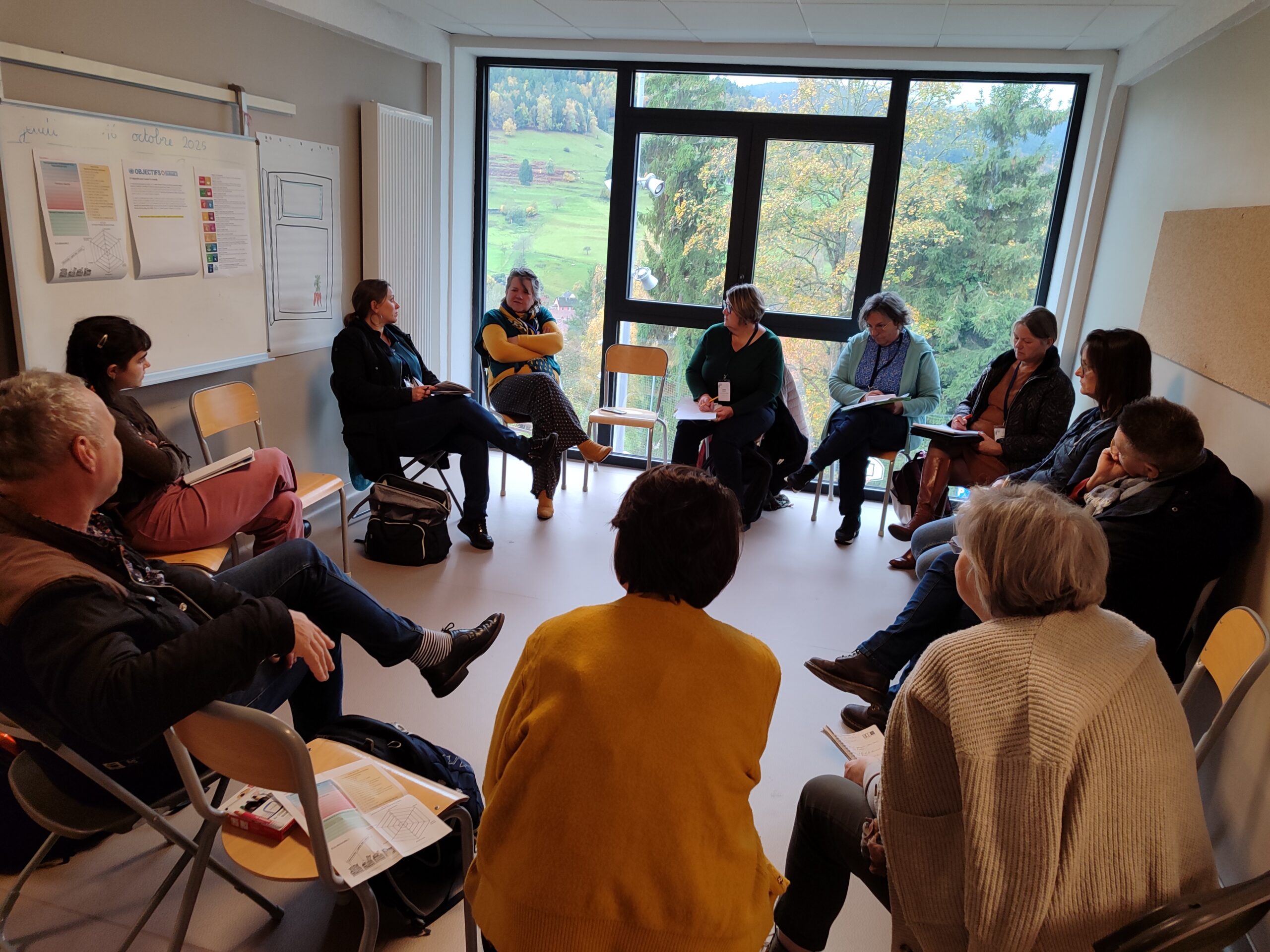 Avec plus de 100 personnes présentes, venues de toute la France, une intervention théâtralisée de l’ADEME autour de ses quatre scénarios, 10 visites organisées le vendredi 24 octobre, pour aller à la rencontre d’initiatives inspirantes, 15 thématiques différentes à découvrir le samedi 25, dans le cadre d’ateliers contributifs et participatifs animés par une vingtaine d’intervenant·es, une restitution originale sous la forme d’une grande fresque cousue main, des soirées culturelles de qualité et des temps de respiration propices aux échanges informels, le tout accueilli dans un cadre somptueux et avec des équipes locales heureuses de nous recevoir et aux petits soins, l’Univers-Cité Rurale en Alsace a su répondre à toutes les attentes et collectionner les sourires !
